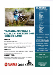 Yamaha Central & COMCC Present 2019 4 Hr XC RaceJunior Sign in 7.30 - 8.15 am, Briefing 8.30 am, Racing 9 - 10 am